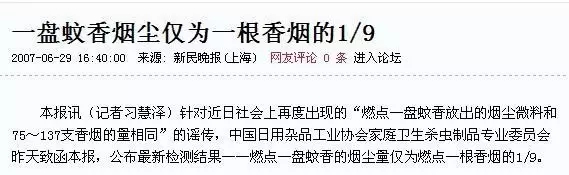 而那个在朋友圈流传的所谓一盘蚊香相当于100根香烟的文章其实是一个不折不扣的老梗了,差不多10年前就已经被伪证了!只不过,每年夏天都会被人拿出来“科普”一下。