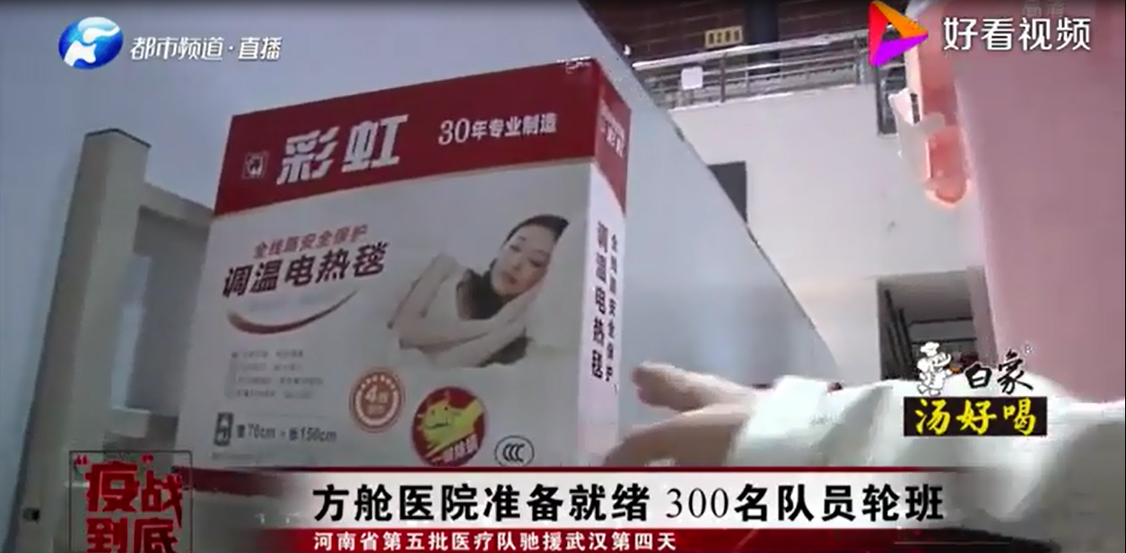 乐鱼leyu(中国)电热毯已成为武汉多个方舱医院标准配置的取暖用品,各大电视媒体纷纷报道,网络平台也时有图像视频发出,彰显了我们成都造的品牌和品质。为打赢这场战“疫”,我们送去了乐鱼leyu(中国)温暖,体现了乐鱼leyu(中国)爱心,贡献了乐鱼leyu(中国)力量!