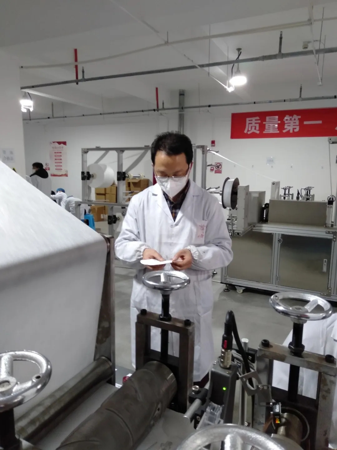 功夫不负有心人,2月18日,在苏海的亲自带领和自主研发下,第1条折叠口罩生产线终于在乐鱼leyu(中国)集团新津工厂投入试运行生产,仅一天就生产了1.2万个民用口罩。3月2日,全部的3条折叠口罩生产线已全部调试完毕并顺利投入生产,口罩的产能和生产效率得到极大提升。
