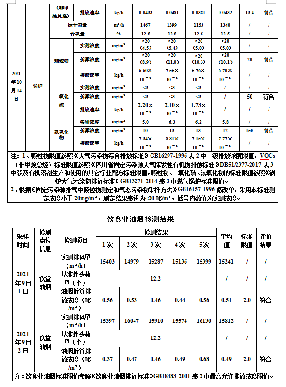 公司《排放污染物许可证》(证书编号:川环许A武2280)排放主要污染物种类及浓度:PH:6~9;SS:400mg/L;COD:500mg/L;NH3-N:45mg/L;BOD5:300mg/L;动植物油:100mg/L;LAS:20mg/L;二氧化硫:100mg/ m³;氮氧化物:400mg/m³。