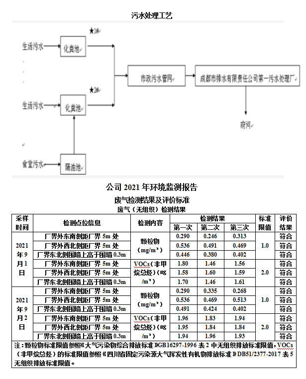 废水:公司在生产过程中无生产废水排放,仅有生活污水排放,主要产生于职工洗手、洗澡、卫生间清洗和食堂用水等。食堂污水先经隔离池处理后,再与其它生活污水一同进入化粪池处理后,经武侯新城污水管网,直接进入三环路城市污水管网,然后经成都市排水有限责任公司第一污水处理厂处理后,最终排入府河。
